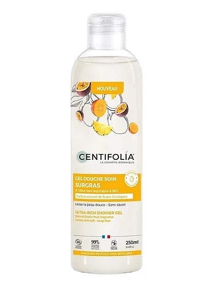 Le gel douche soin surgras au parfum naturel de fruit exotique de la marque Centifolia.